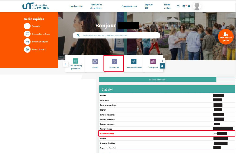 Pour les personnels, saisissez votre numéro SIHAM disponible sur UT-Net (https://utnet.univ-tours.fr) > Mon espace perso > Dossier RH > Données individuelles.